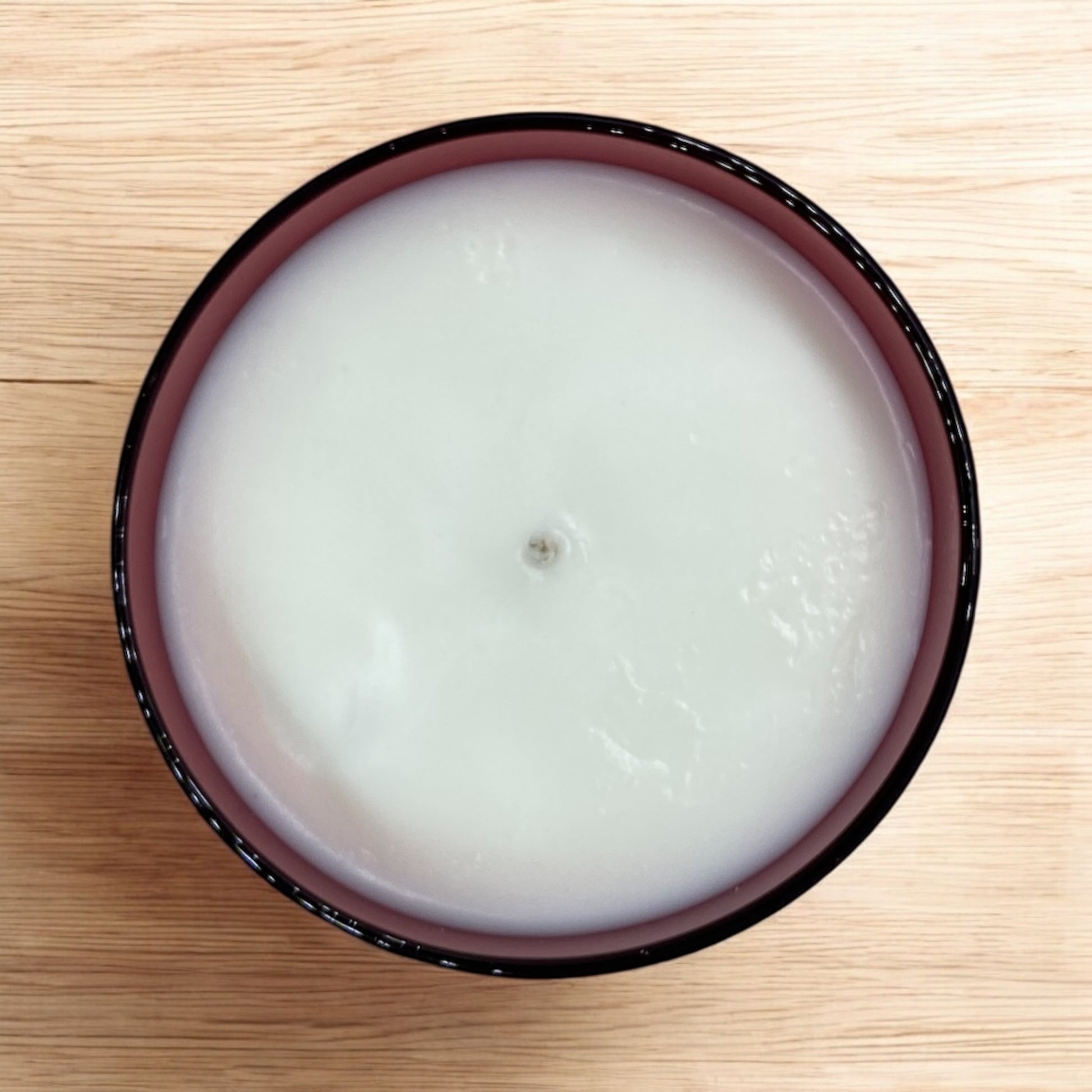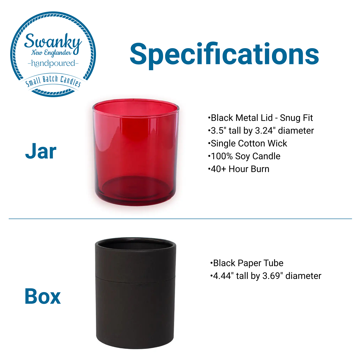 •9oz poured into red-colored sea glass jar with black snug fit lid.